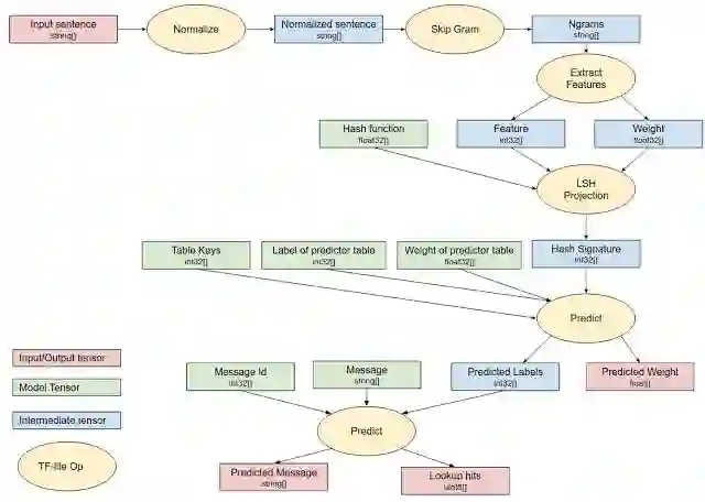 有趣的是,以上所描述的机器学习架构能为背后的模型提供灵活的选择。我们还设计了可兼容不同机器学习方法的架构,例如,当使用 TensorFlow 进行深度学习的时候,我们是为背后的模型学习了一个轻量神经网络(ProjectionNet),然而当用另一个不同的架构(ProjectionGraph)的时候,我们是使用图框架而不是神经网络表示模型。