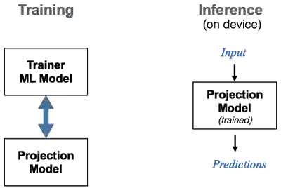根据这个概念,会话模型在较低的计算力水平和内存占用下结合了这些高效的运算。我们使用一个 ML 框架以端到端的方式训练这个设备上的模型,该框架能联合训练两个类型的模型,即紧密的 Projection 模型和 Trainer 模型。这两个模型以联合的方式进行训练,Projection 模型从 Trainer 模型中学习信息,而 Trainer 模型更像一个导师,它一般使用更大和复杂的 ML 架构进行建模,因此 Projection 就像一个学生从 Trainer 模型中学习它所知道的知识。在训练过程中,我们能叠加其它如量化或精炼等技术而实现更加强大的压缩或选择性地优化目标函数的特定部分。一旦训练完成,较小的投影模型就能直接在移动设备上执行推断了。