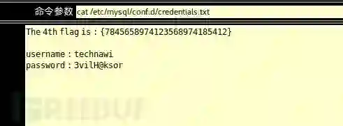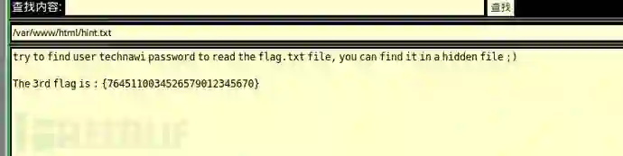 本次使用的是PHP大马,登陆shell在网站根目录发现 hint.txt ,访问得到第3个flag并得到提示信息: