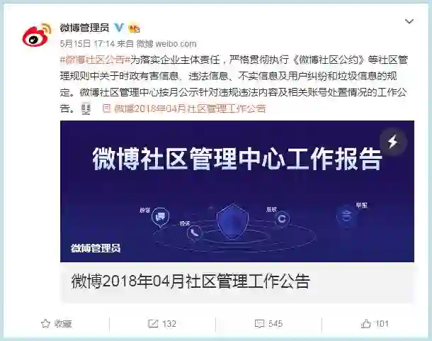 昨日,据微博管理员消息,为落实企业主体责任,严格贯彻执行《微博社区公约》等社区管理规则中关于时政有害信息、违法信息、不实信息,及用户纠纷和垃圾信息的规定,对微博内存在的违规违法内容进行清查处置。