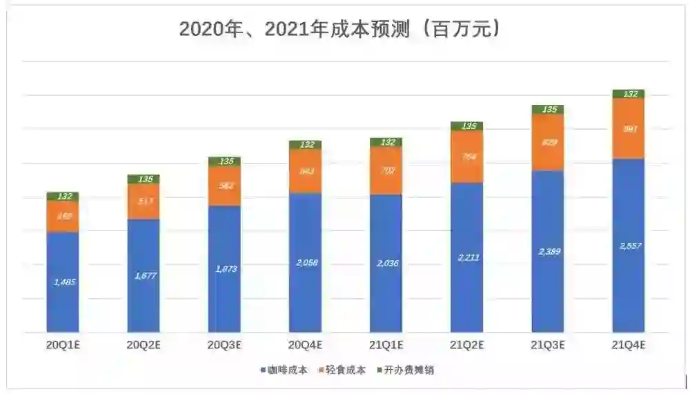 由于规模效益,假设2020年每杯成本降至11元,2021年降到10元。2020年、2021年总成本227亿元,毛利润65.5亿元。