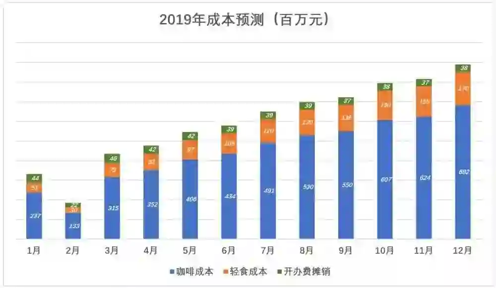 瑞幸咖啡主要成本包括咖啡(包括食材、房租、人工等),轻食成本及门店开办费摊销。2019年,三大成本分别为53.6亿、13亿和4.63亿,共计48.06亿元,毛利润近9.3亿。