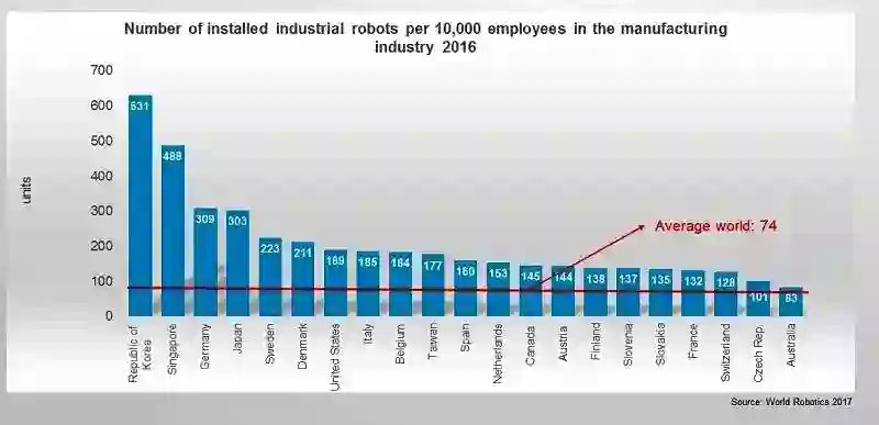 IFR的报告指出,光以汽车制造业来看,韩国汽车制造业机器人密度达到2145;而美国与日本的汽车制造业机器人密度则分别为1261与1240。
