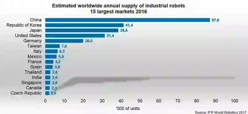 而IFR的报告也指出,只看特定市场的整体工业机器人单位销售量数字、忽略每个区域市场/国家的制造业规模,很有可能会被误导;为了提供更精确的分析,该机构还统计了制造业每1万个从业人员中的工业机器人密度──该数字在2016年的全球平均值为74。