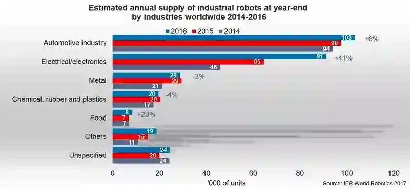 从应用来看,汽车制造(市占率35%)与电气/电子制造(市占率31%)一直是两个最大的工业机器人应用领域。而相较于汽车制造应用在2016年仅6%的成长率,电气/电子制造应用在过去几年迅速成长,工业机器人单位销售量自2015年来达到了41%的增长水平;在大多数亚洲市场,电气/电子制造也是最大的工业机器人应用领域。