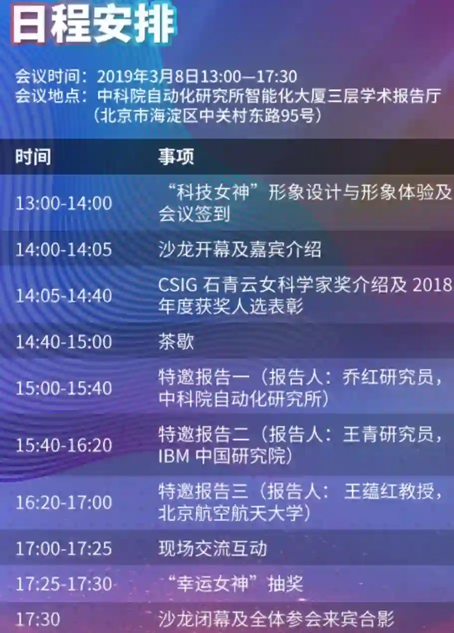 以下为最终科技沙龙具体议程安排,如果你对此次活动感兴趣,可点击【阅读原文】免费报名参与浏览更多详情。除了聆听受邀嘉宾的学术报告演讲外,会场还将免费送出“科技女神”形象设计与精美礼品。