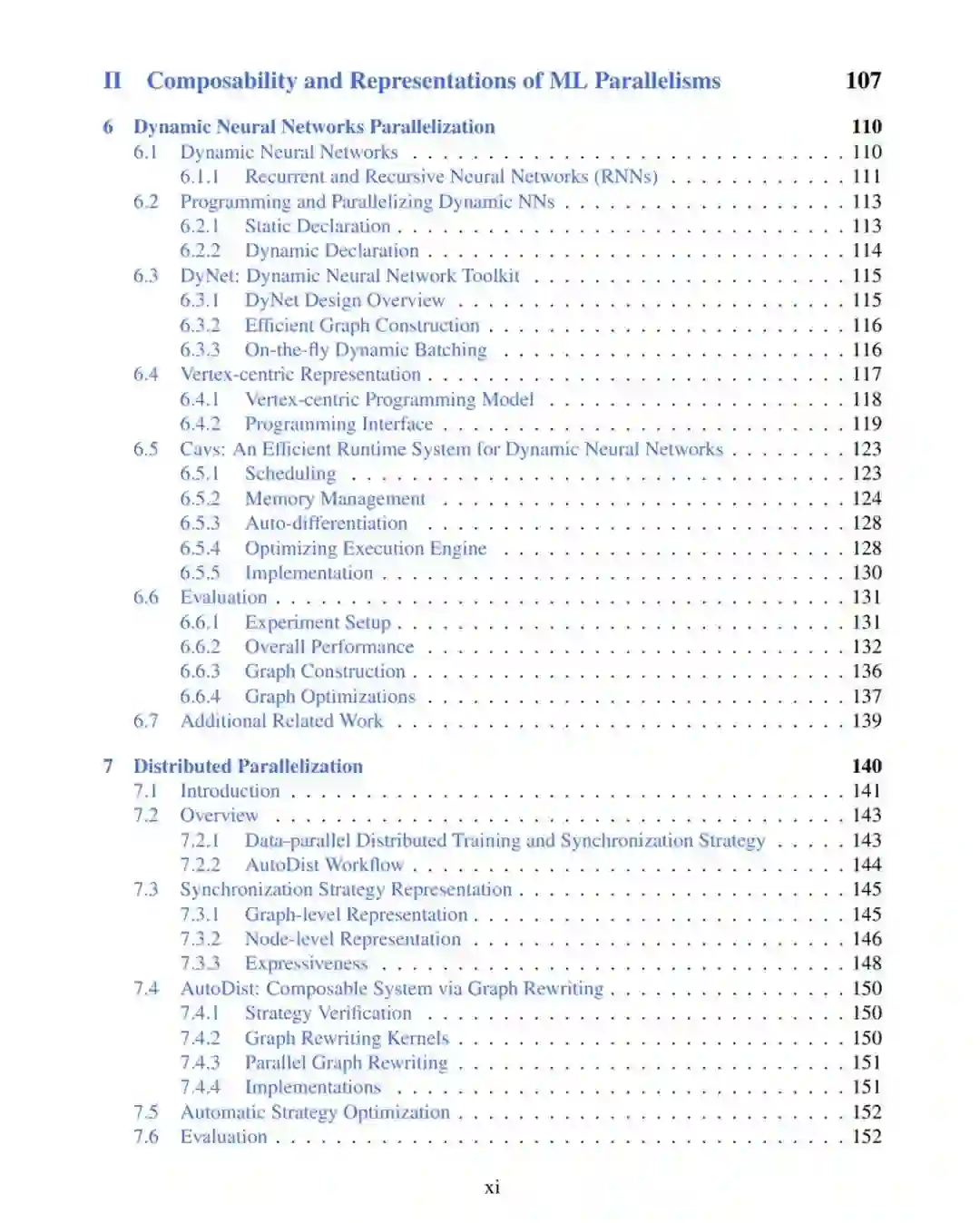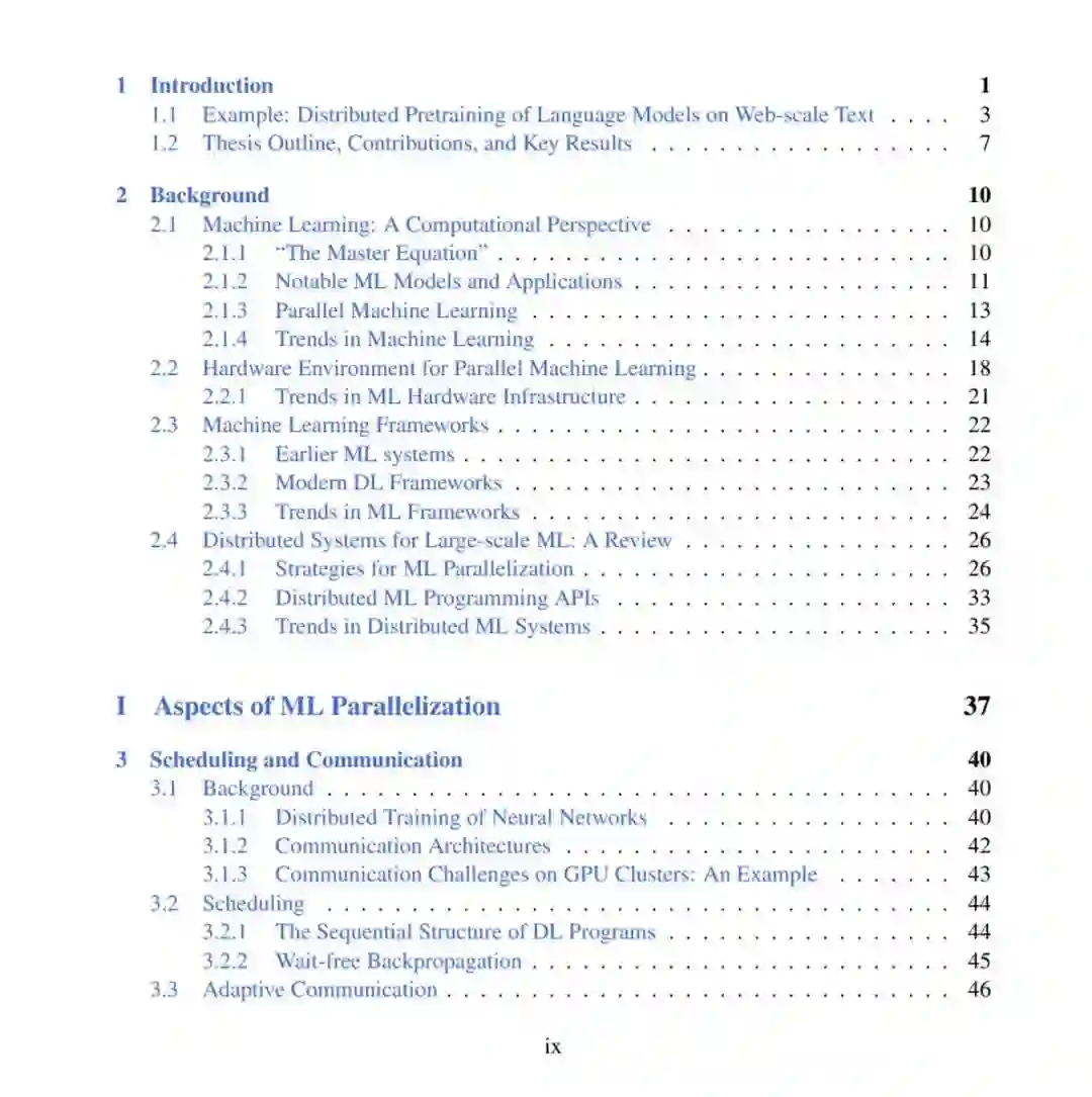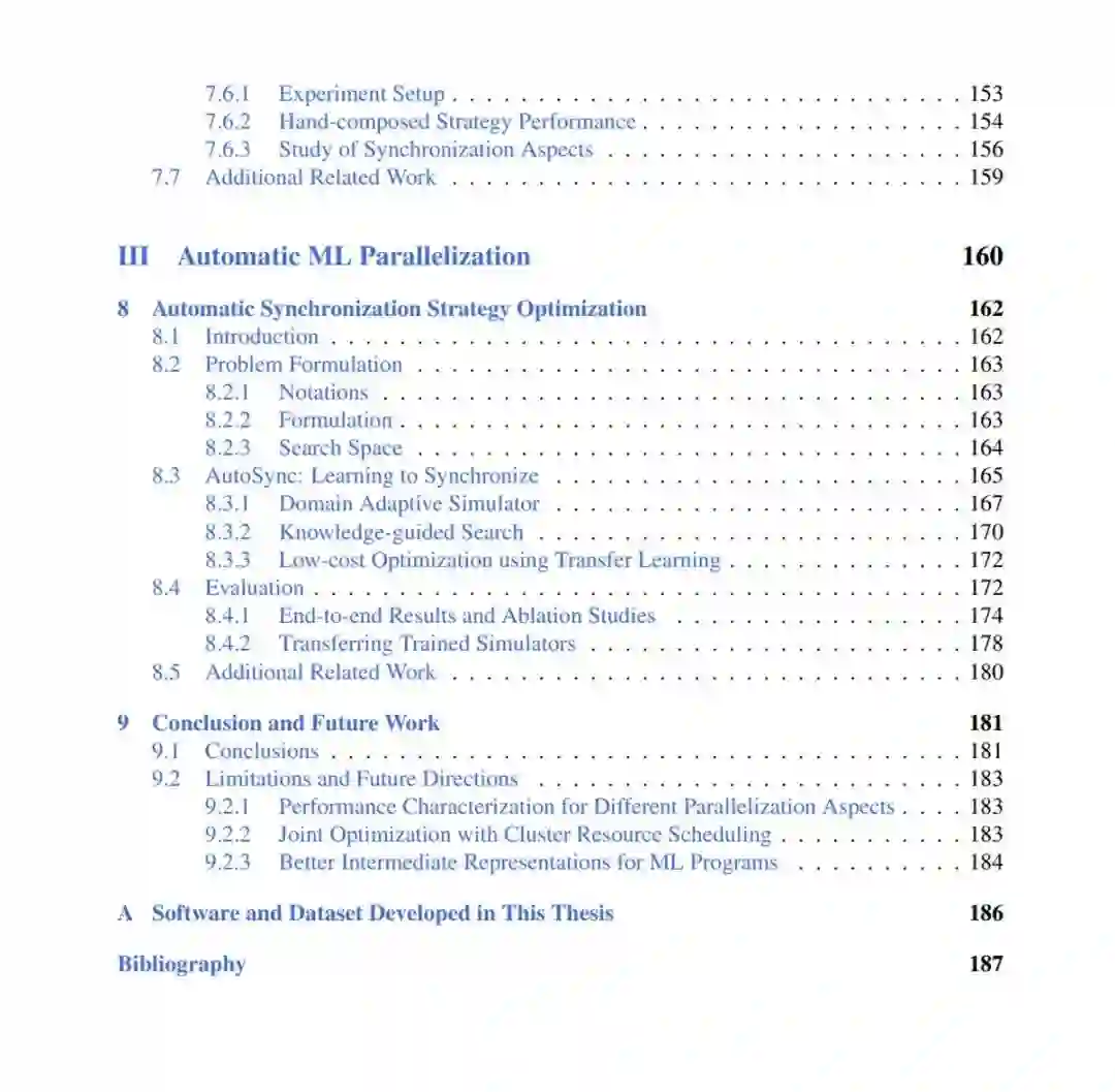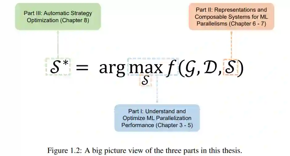 这篇论文主要由三部分组成,如下图所示,第 1 部分(第三章 - 第五章):在单个机器学习并行化层面,使用自适应并行化理解和优化并行机器学习性能;第 2 部分(第六章 - 第七章):为机器学习并行开发统一的表示和可组合系统;第 3 部分(第八章):机器学习并行化的自动化。
