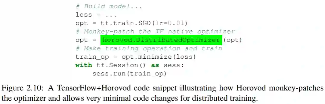 这些 TensorFlow+Horovod 代码片段展示了 Horovod 如何给优化器打补丁,以及如何为分布式训练进行非常小的代码改变。