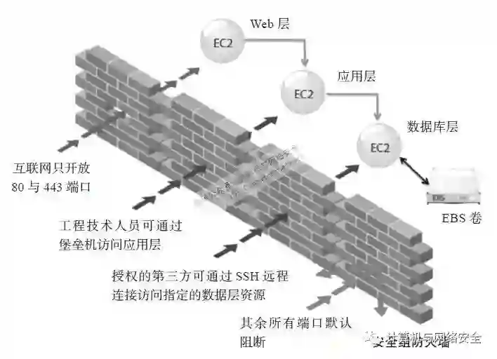 这张图源于AWS对云平台的securitygroup(安全组,相当于3层的防火墙ACL)功能的举例描述。其中Web层是直接在互联网上暴露给用户的,而应用层不需要直接暴露在互联网上,它只需要接受Web的请求,以及能访问位于更靠后一层的数据库层,数据库层则只需要接受来自应用层的请求,同时自己的I/O来自于EBS卷,默认这些服务器都需要接受管理员的SSH连接,但管理员并非从互联网直接发起连接,而是先登录到堡垒主机或统一的运维跳板机,由此再发起向Web层、应用层、数据库层的各SSH连接,如果是使用自动化运维工具的场景,则3层的服务器要接受来自运维管理平台(例如Puppet、SaltStack服务端)的连接,这样每层只对外开放最小端口,除必要的协议外默认全部阻止访问。
