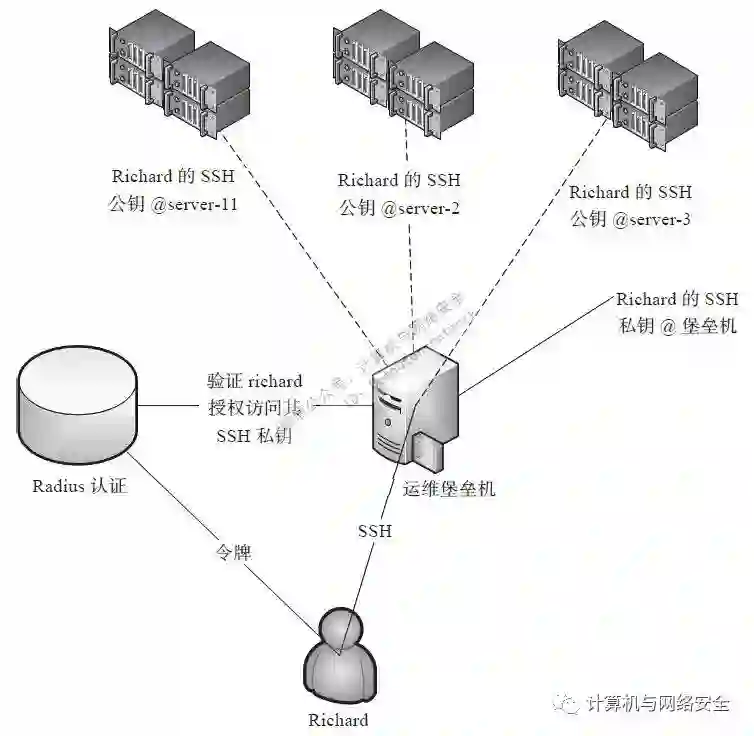 在Radius上新建用户Richard,为该用户生成SSH的公私钥对,使用自动化运维工具将公钥分发到该用户拥有对应权限的服务器上。用户的SSH连接由堡垒机托管,登录时到Radius服务器使用动态令牌认证身份,认证成功后授权访问其私钥,则对于有SSH公钥的服务器该用户都可以登录。网络访问控制上应设置服务器SSHD服务的访问源地址为堡垒机的IP。