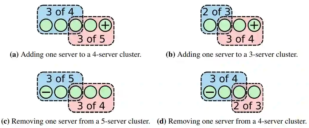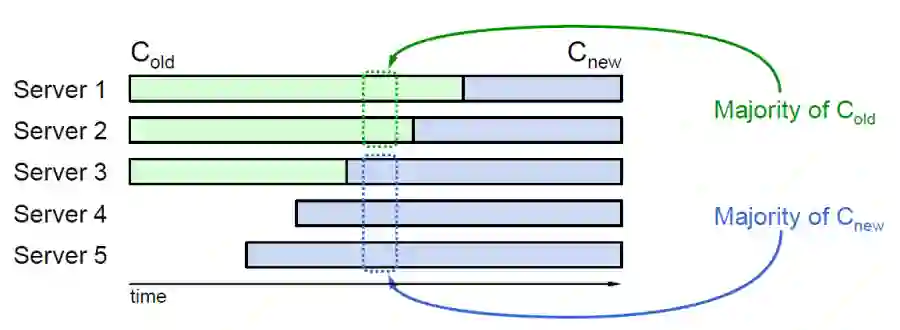 在COP日志之前的日志只需要旧成员配置S中的多数派确认,可以在旧成员配置和新成员配置(S U S‘)中提交;在COP命令之后且在S’的激活消息ACTIVATE之前的日志需要新旧成员配置(S U S‘)两个多数派确认,并且只能在S’中提交;在S’的激活消息ACTIVATE后的日志,只需要在S‘中确认和提交。