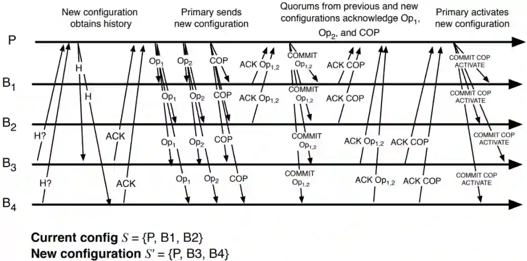 为了让新节点追上最新数据,新成员配置S’中的新节点B3、B4先连接到当前的主节点P,P会向它们传输自己当前的状态作为他们的初始状态。在Zab协议中当备节点连接上主节点时这样的状态传输就会自动发生,并且会继续从主节点P接收所有后续的操作日志(例如图中的Op1和Op2),这个过程中节点B3、B4不参与投票。