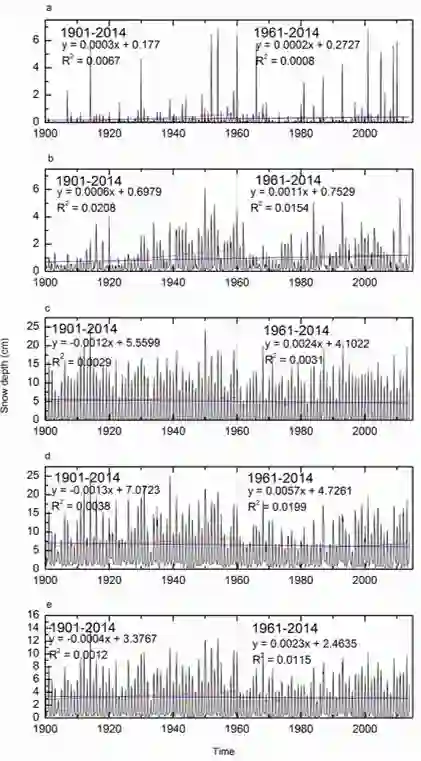 针对我国天山山区积雪雪深百年尺度的变化特征评估这一科学问题,中国科学院新疆生态与地理研究所研究员李兰海团队利用1901-2014年的再分析资料和1961-2014年的观测资料,应用人工神经网络(ANN)方法,重建了天山地区1901-1960年雪深数据,分析了中国天山地区过去百年雪深历史的变化特征。以1901-1960、1961-2014和1901-2014期间月降雪深度的变化,分别作为历史、观测和百年尺度周期进行雪深变化趋势评估。
