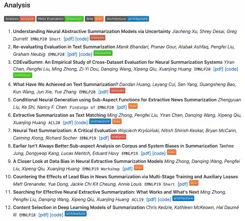 受yizhen20133868/NLP-Conferences-Code[11],teacherpeterpan/Question-Generation-Paper-List[12],thunlp/PLMpapers[13],thu-coai/PaperForONLG[14],NiuTrans/ABigSurvey[15]等项目的激励,旨在整理现有摘要研究成果,追踪最新摘要论文,中心文本生成组博士生冯夏冲收集并整理了摘要论文阅读列表,该列表每条信息包括论文题目,作者,PDF链接,论文来源,是否有实现代码,可以帮助研究者快速整合该方向核心资料,并会长期维护和迭代整理现有论文列表。