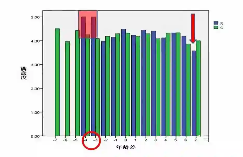 在婚姻家庭中,男性比妻子年龄小3、4岁的被访者,对伴侣的满意度达到峰值;相对地,男性年龄比女伴年龄大7岁时,满意度最低。