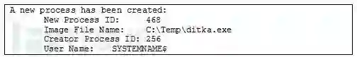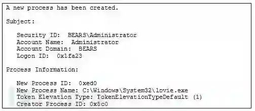 如果Windows Event Log(事件日志)的审计设置开启了Audit Process Tracking(审计进程追踪)功能,那么Windows Security Event Log(安全事件日志)中将会记录大量关于进程的信息,而这些信息绝对能够证明一个文件是否执行过。下面这两张图片显示了恶意文件、相关进程ID、父进程ID和用户名,这些信息可以帮助我们进行进一步分析: