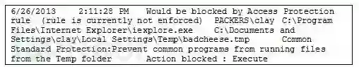 除此之外,基于主机的IPS或反病毒产品日志同样可以表明一个文件是否执行过,或者曾经尝试执行过。下图给出的是McAfee Access Protection日志中记录下的一次访问事件样本: