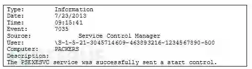 为了确定一个文件是否执行过,我们还可以根据日志文件的分析结果来判断。首先我们来看一看Windows System Event Log(系统事件日志),因为这个日志文件记录了服务的启动信息。下图显示的事件(Event ID=”7035″)信息表明,一个管理员(SID=”-500″)运行了PSEXECSVC远程执行服务: