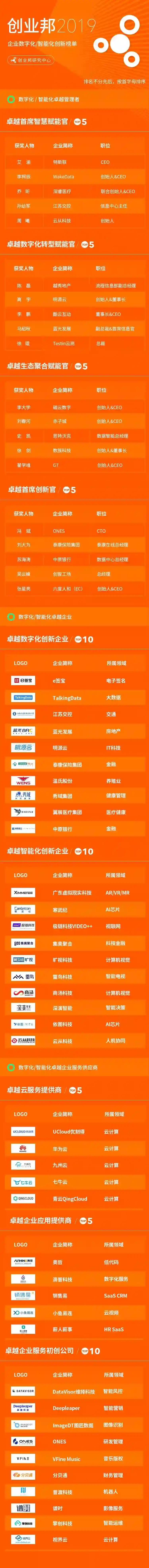 创业邦“2019企业数字化/智能化创新榜单”如下: