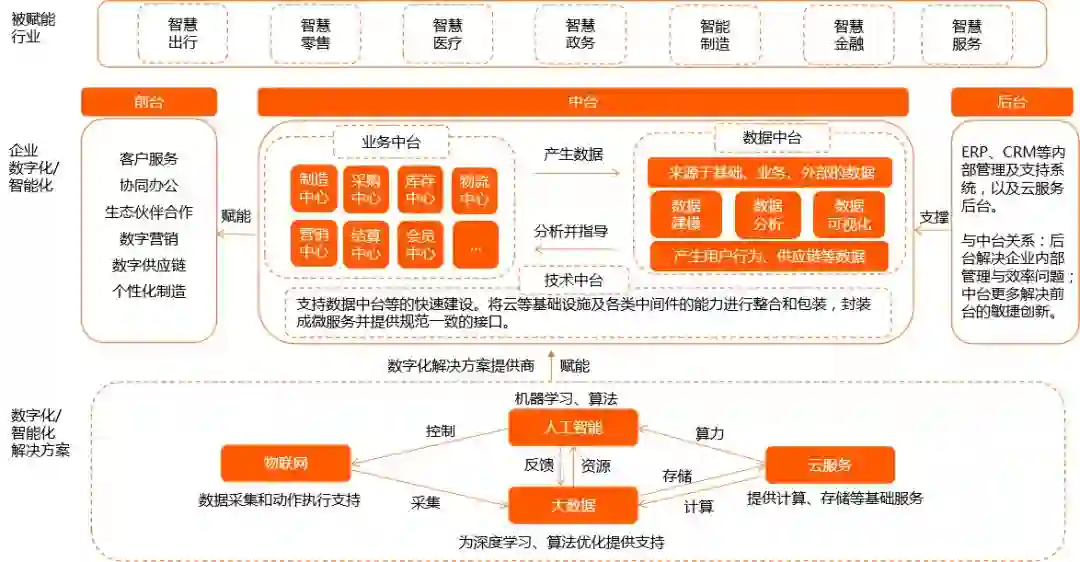 企业被赋能方式包括构建数据中台、业务中台等中台架构,以及企业上云等方式,从而真正实现复杂商业环境下的以数据为核心、快速响应及敏捷创新。目前以BATJ为代表的互联网头部企业搭建的中台架构变革正引领企业数字化/智能化转型趋势。数字化/智能化转型带来的智慧零售、智能制造等正引领传统产业升级的发展方向。