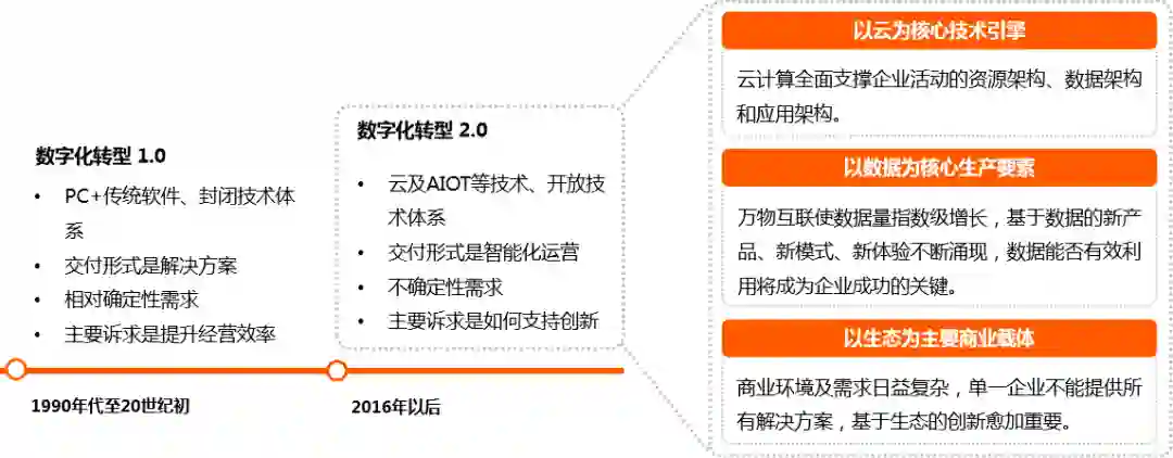 随着产品和服务复杂化、场景多样化、供应链复杂化,以优化企业经营效率为主的IT技术体系,不能支撑未来企业的产品创新、业务创新、组织创新、管理创新。2016年起,头部互联网企业引领数字化转型进入2.0时代,在新商业背景下为传统企业数字化转型及创新发展提供全新方案。