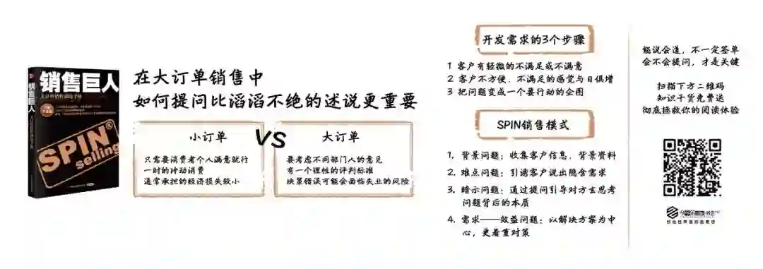 《销售巨人》是由尼尔·雷克汉姆专门针对销售中大订单这一细分领域,结合自身多年服务于世界一线品牌销售的经验,以及大量的销售实例观察,总结出的一本权威性经典书籍,他在书中创造性地提出了专门应用于大订单销售且十分有效的SPIN销售模式。这种模式是一种用于向客户提问和开发潜在客户需求的工具,几乎成为所有大客户销售经理必须掌握的专业技能。目前SPIN销售模式被诸如华为通讯、阿里巴巴、奥迪汽车、艾默生电器等众多世界500强企业广泛应用,效果显著。