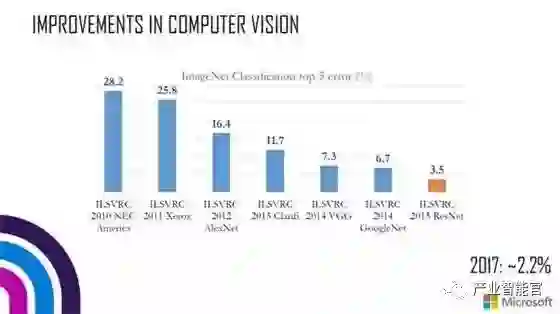 我们也看到过去 8 年多在语言处理和语音识别方面出现了类似的进步。今年,微软通过基于 CNN 和双向 LSTM 的架构实现了语音识别的 human parity。