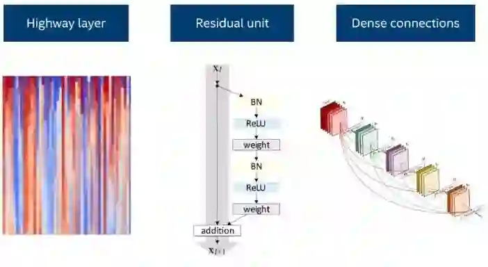 在深度学习的网络层方面,为了使得信号和梯度能够更容易地传递到深度神经网络的每一层,残差结构单元(residual layer)、highway 层(全连接的 highway 网络)以及稠密连接(dense connections)结构应运而生。有了这些网络层,目前最先进的计算机视觉技术通过利用深度学习网络的表示能力得以实现。同时,他们也在许多自然语言处理任务上提高了模型的性能。例如,将稠密连接的循环层用于语言模型(Improving Language Modeling using Densely Connected Recurrent Neural Networks,https://arxiv.org/abs/1707.06130 )。