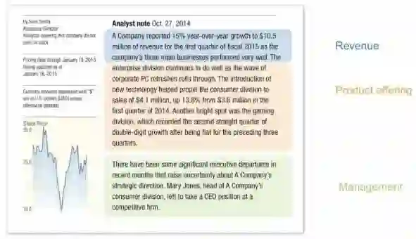 金融业面临着巨大的知识管理挑战,这是由每天必须处理和理解的文件的数量(太大)所造成的。从一页又一页的文本中提取出诸如「某种特定产品的竞争力」这样的关键的见解是十分困难的。