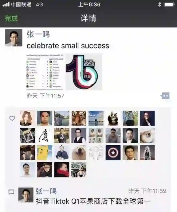 2018年5月张一鸣晒出截图