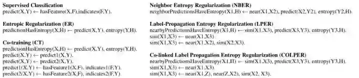 这项研究由卡耐基梅隆大学(CMU)与腾讯 AI Lab 合作完成,提出了一种新的声明式列举规则的半监督学习的方法,可用于定制化半监督学习。这种方法可以组合多个半监督学习策略,同时可以结合多个协议(agreement)约束和熵正则化(entropic regularization)约束。此外,这种方法还可以用于模拟其它常见的模型,比如联合训练和针对全新域的启发式方法。除了表征单个的半监督学习启发式方法,研究者还表明可以使用贝叶斯优化将多种启发式方法组合到一起。在多个数据集上的实验结果表明这种方法能稳定地优于其它方法,并在一个较困难的关系抽取任务上得到了当前最佳的结果。