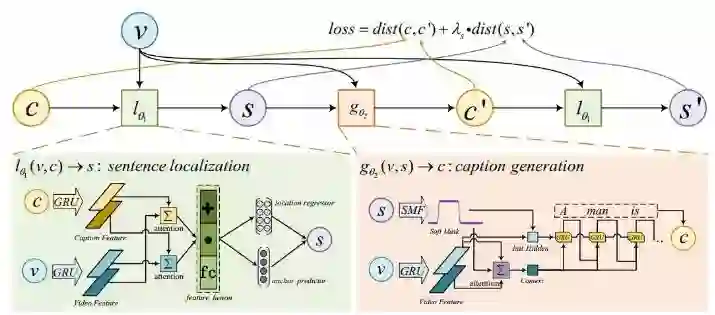 新提出的模型结构及其训练连接如上图所示。该模型由一个语句定位器和一个描述生成器组成。在训练过程中,模型可使用视频及其所有的事件描述。首先语句定位器会使用视频和其中一个事件描述来获得一个时间片段预测,然后描述生成器会使用这个时间片段来生成一个描述语句。
