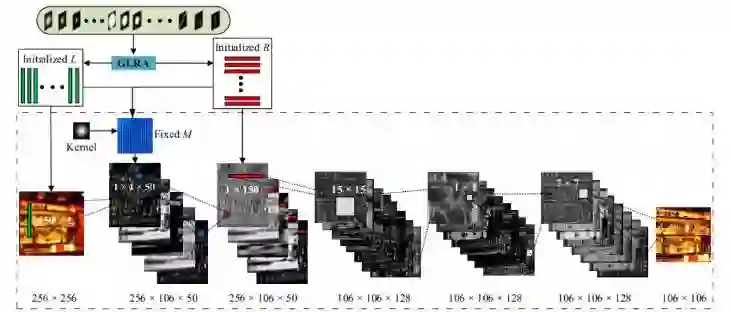 新提出的去卷积网络的架构,其中通过广义低秩近(GLRA)使用大量模糊核(blur kernel)的可分离过滤器来初始化第 1 层和第 3 层的参数,并使用为每个模糊核估计的 M 来固定第 2 个卷积核中的参数。另外还堆叠了额外的 3 个卷积层来去除伪影。