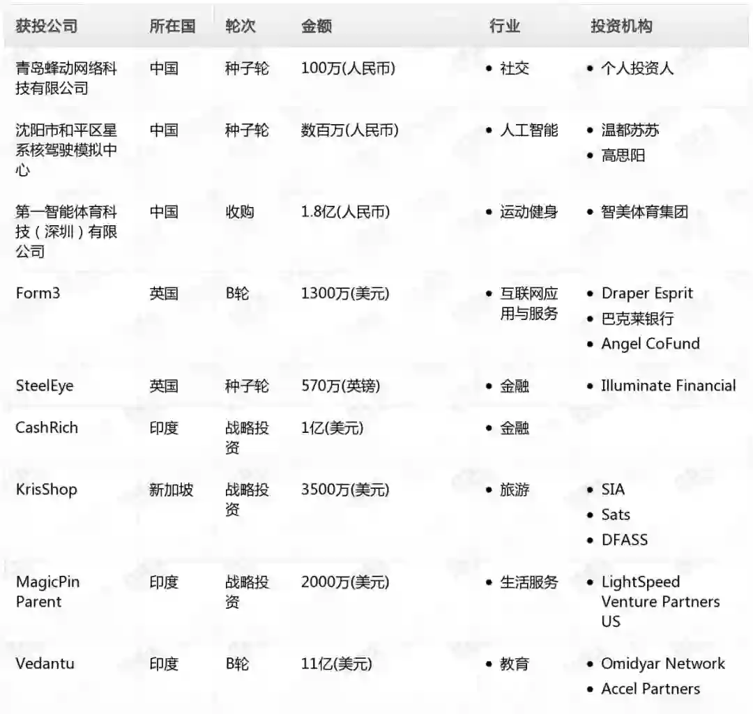 中国境内科技行业投融资总额约1.83亿人民币,单笔最大交易事件发生在运动健身行业,获得融资的企业为第一智能体育科技(深圳)有限公司,交易金额高达1.8亿人民币。