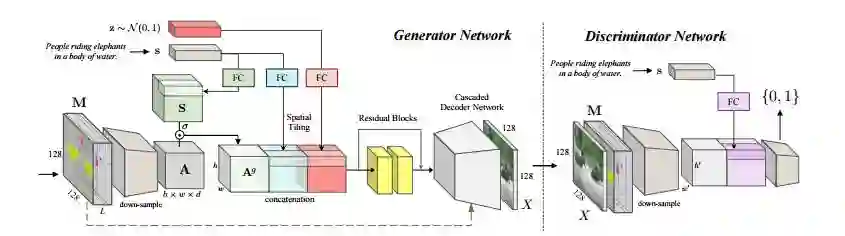 然而,对于现有方法来说,它们的成功主要局限于诸如鸟类和花朵等这些简单的数据集,而像MS-COCO这样复杂的、真实图像的生成,对于它们来说仍然是一个很大的、公开性的挑战。如图1所示,从“人们骑在大象身上穿过一条河(people riding on elephants that are walking through a river)”这样的通用句子中生成图像,需要对各种视觉概念进行多种推理,诸如目标类别(人和大象)、目标的空间配置(骑着),场景环境(穿过一条河流)等等,这远比在较简单的数据集中生成单一的、大型的目标要复杂得多。现有的方法在为这种复杂的文本描述生成合理的图像方面还没有取得成功,因为从通用图像中学习一个文本到像素的直接映射是非常复杂的。