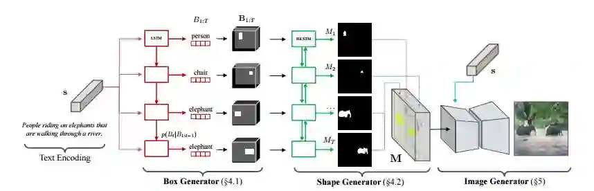 本文所提出算法的总体框架。给定一个文本描述,我们的算法序列性地构造一个场景的语义结构,并生成一个基于推断布局和文本的图像。可以根据标注的颜色进行查看。