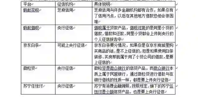 信用分对每个人都如此重要,而网贷金融产品的使用范围真的很广,所以我们要弄清楚常见的金融产品是不是会上征信——其实除了银行系统,京东白条、蚂蚁借呗、微粒贷、苏宁任性付、百度金融等这些大公司的产品基本都已经接入了征信系统哦。具体见下图: