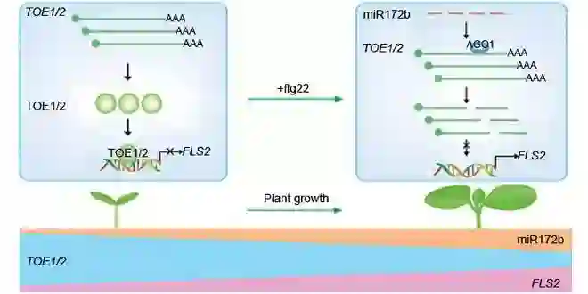 新生儿出生后其免疫系统经历了快速、剧烈的变化。那么,植物在种子萌发后其天然免疫系统是否也会随个体的发育而逐步成熟呢?中国科学院遗传与发育生物学研究所农业资源研究中心吕东平研究组与福建农林大学唐定中研究组合作发现,由免疫受体FLS2介导的免疫反应在拟南芥幼苗的生长过程中逐步增强,而且,这个过程受免疫受体FLS2基因转录的控制。进一步研究发现,两个AP2类转录因子TOE1和TOE2可以直接与FLS2基因的启动子结合,并抑制FLS2基因的转录。已知TOE1和TOE2为小RNA miR172靶基因,该研究发现,在拟南芥幼苗的生长过程中,miR172的丰度逐步升高,TOE1和TOE2的蛋白积累逐渐降低,因此,TOE1和TOE2对FLS2转录的抑制逐步减小,这使得FLS2基因在幼苗的生长过程中的表达逐渐提高,最终促成植物天然免疫系统的生成(Ontogeny)。