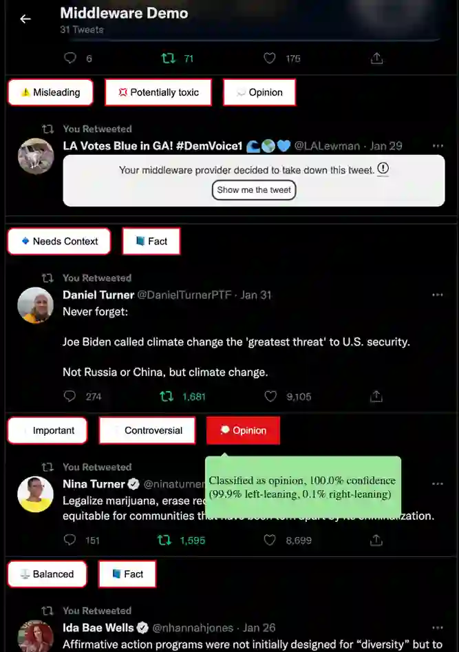 (1)辨别敏感言论,并对这些帖子标记“左倾”或“右倾”分数、“争议性”分数;如果帖子包含仇恨言论等,可以选择不显示该帖子;
