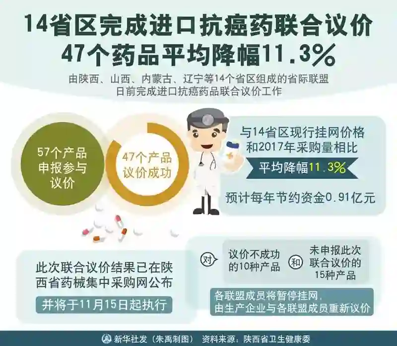 由陕西、山西、内蒙古、辽宁等14个省区组成的省际联盟日前完成进口抗癌药品联合议价工作。57个产品申报参与议价,47个产品议价成功,与14省区现行挂网价格和2017年采购量相比,平均降幅11.3%,预计每年节约资金0.91亿元。