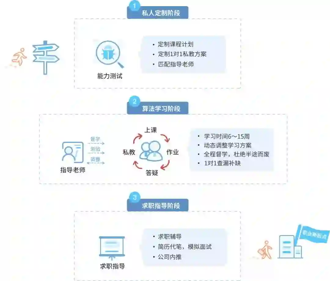 老师将会和学员多次1对1模拟面试。通过模拟面试,教会学员面试的流程、怎样与面试官沟通以及如何包装自己等面试技巧。