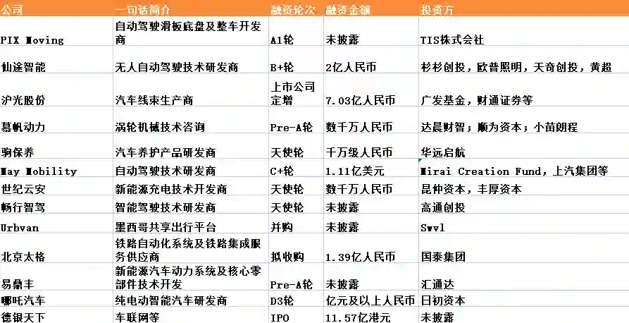本周全球汽车交通领域融资事件共13起,其中国内11起,国外2起。据睿兽分析不完全统计,本周国内汽车交通融资金额总计或超20亿元人民币,海外融资金额超过1.1亿美元。