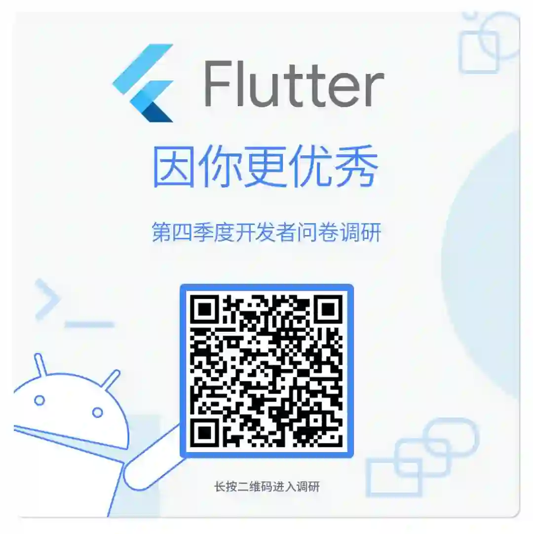 Flutter 因你而变得更优秀。感谢各位中国开发者们一直以来对 Flutter 的热切关注,我们诚挚地邀请您参与第四季度的线上调研,帮助 Flutter 团队更好的改进产品及提升开发者的使用体验。