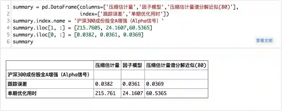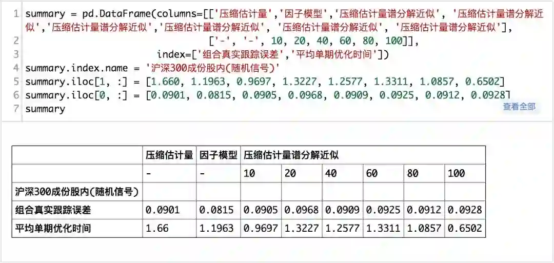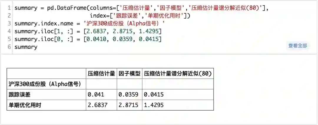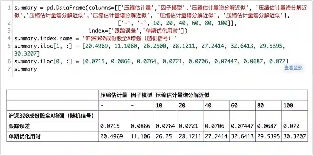 从真实的信号测试的结果来看,在全A范围内使用压缩估计所耗费得到的协方差矩阵进行组合优化所求解的时间明显要多于基本面风险模型和,而压缩矩估计+主成份分解的方法次之,基本面风险模型是最快的而且也是效果最好的,而在沪深300成分股内,则不明显。整体上来说,使用压缩矩估计+主成分分解来估计协方差矩阵是可行的。