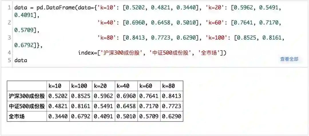 从上表的结果来看,对于沪深300成份股、中证500成份股前20个最大特征值之和占比就超过了50%;当k取100时,沪深300成分股超过了80%,但是中证500成份股依然没有达到80%,并且对于全市场来说,k取100方差解释度不足70%。
