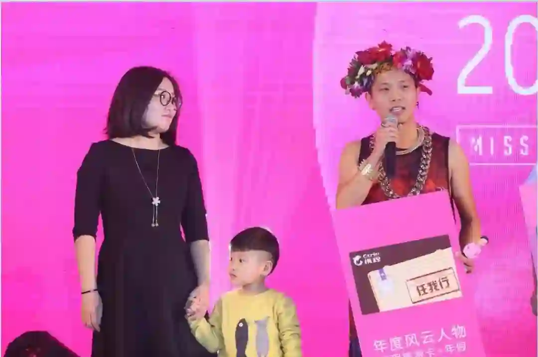 用画板和儿子保持沟通的张秋胜,和家人一起在年会领奖台上