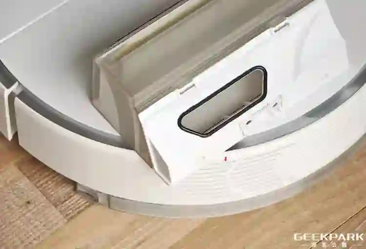 拖地作为去年产品发售以后大家最希望添加的功能,这一次是通过水箱模块实现的。它被设计成抽屉形状(如上图这样),右侧的水箱盖标识指导用户从此处灌水。如果你留意的话, 能看到两边各有一个卡扣,通过它可以安装到扫地机器人底部,整个过程就像把抽屉塞进桌子一样,非常简单。