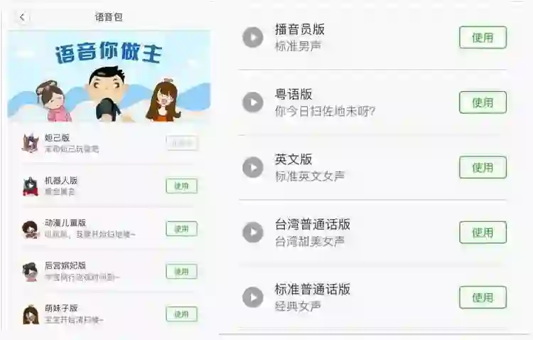 在我短暂的体验过程中,还发现不少让人惊喜的事情,比如在启动机器人之后,听到的语音反馈可以像手机地图那样更换语音包,这些语音包都很有特色,比如《王者荣耀》风格的妲己版语音,会说「来和妲己玩吧」,或者「返回泉水」这样好玩的话,还有《蜡笔小新》风格的动漫儿童包,说出一些话也很萌很可爱,当然,这也不仅仅是好玩的事情,粤语和英文的加入也非常贴心的考虑到更多人群。