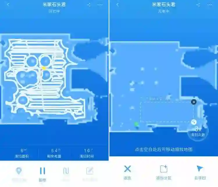 开启的方式很简单,通过米家 app,可以看到地图数据,点击下面的「划区清扫」,就能设定一个矩形区域,并设定清扫次数,点击「去清扫」之后,机器人就可以在指定区域按照你的要求来回打扫。