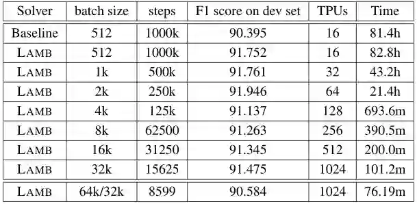 展示了LAMB在多个挑战性任务中的强大实证性能。使用LAMB,将训练BERT的批量大小扩展到32k以上,而不会降低性能;时间从3天减少到76分钟。这是目前将BERT训练经过时间减少到几个小时以内的第一项工作。